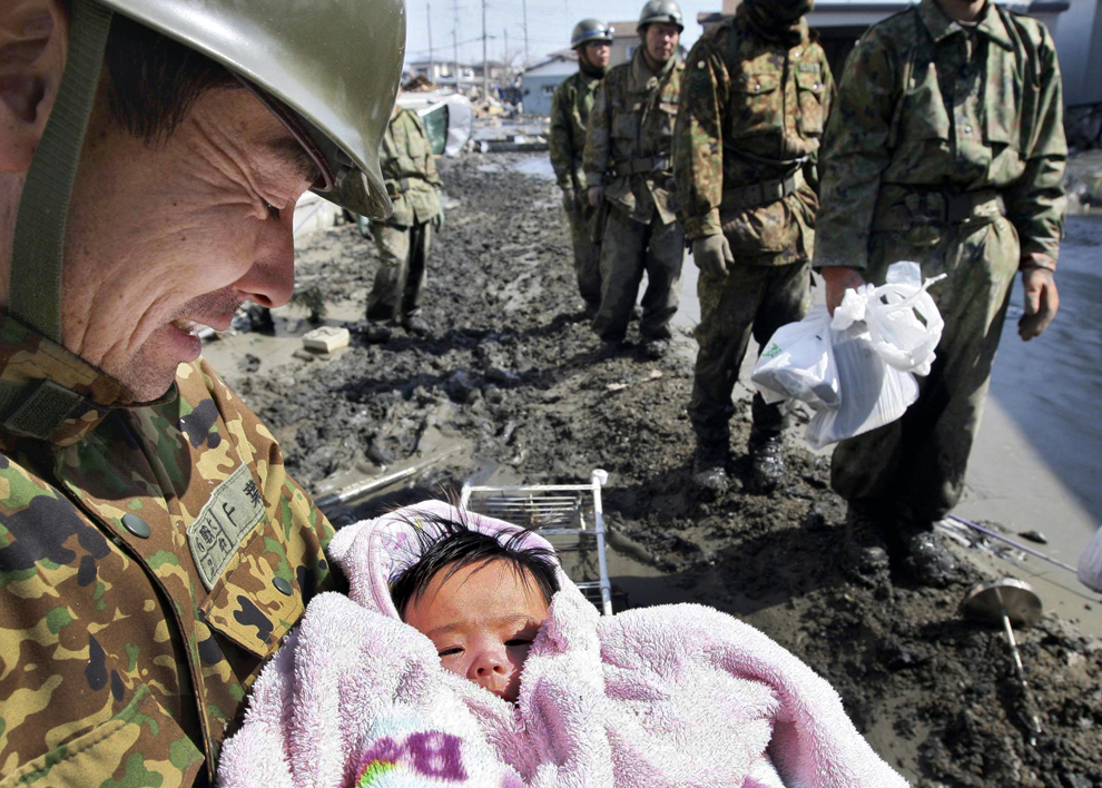 A soldier holds a four-month-old baby who survived the tsunami with her family at Ishinomaki city in Miyagi prefecture on March 14, 2011. (Yomiuri Shimbun/AFP/Getty Images)
